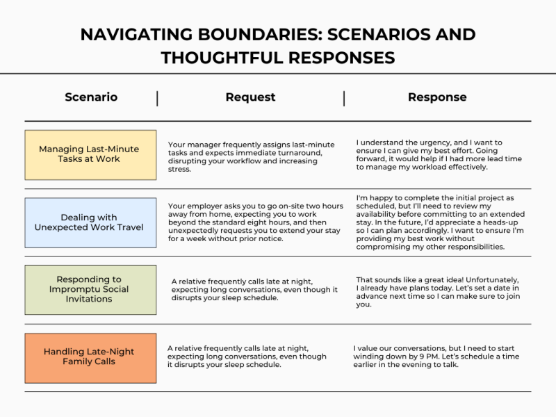 Having boundaries is one thing but communicating them is where the magic happens. Be direct and clear about what you need. Don’t beat around the bush. For instance, you might say, “I’m unavailable for meetings after 6 PM,” to set a clear professional boundary. In personal settings, you could tell a friend, “I need at least a day’s notice before making plans.” Keep it respectful, but firm.